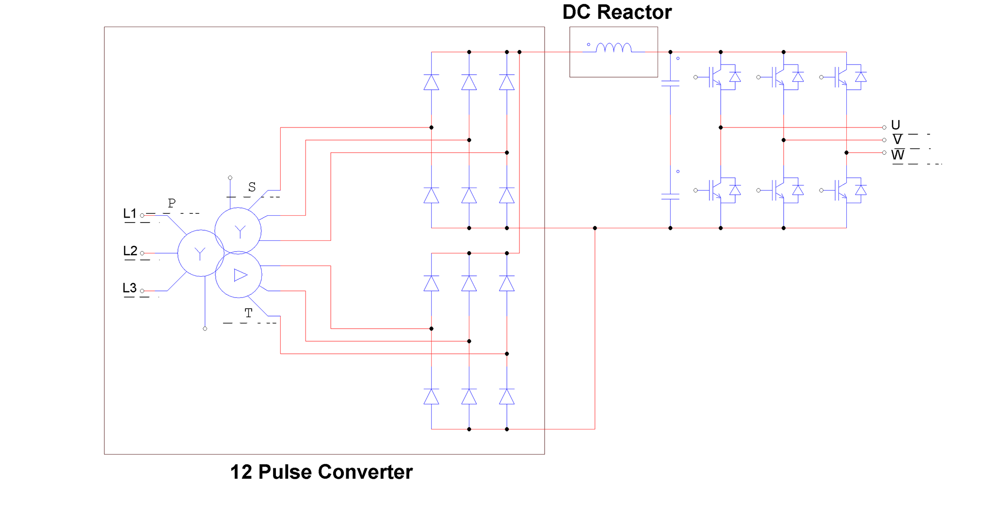 How it works? | Offers high impedance that limits high frequency currents. | Two parallel 6-pulse converters, each fed by isolated 30° phase shifted secondary. Mitigates 5th and 7th order harmonics. Input impedance mitigates higher-order harmonics as well. | Three parallel 6-pulse converters, each fed by isolated 30° phase shifted secondary. Cancels all harmonics below 17th order. Input impedance mitigates higher-order harmonics as well. | Designed to provide low input impedance path for the 5th and 7th harmonics, connected in shunt. | IGBT-based active bridge with L-C-L filter, connected in series, always operates in boost mode and draws sinusoidal current from the mains. | IGBT-based active bridge with L-C-L filter, connected in shunt, actively measures and injects equal and opposite harmonics into the system, canceling most harmonic currents below the 50th harmonic. |